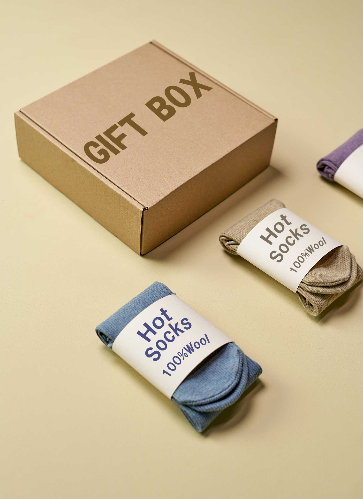 靴下という身近なアイテムに、統一感のある色味と整ったレイアウトを加えることで、ギフトとして受け取った際の温かみと信頼感を表現しました。